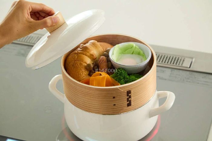 ぴたっとはまる蒸篭がついた特製のホーロー鍋。蒸篭…